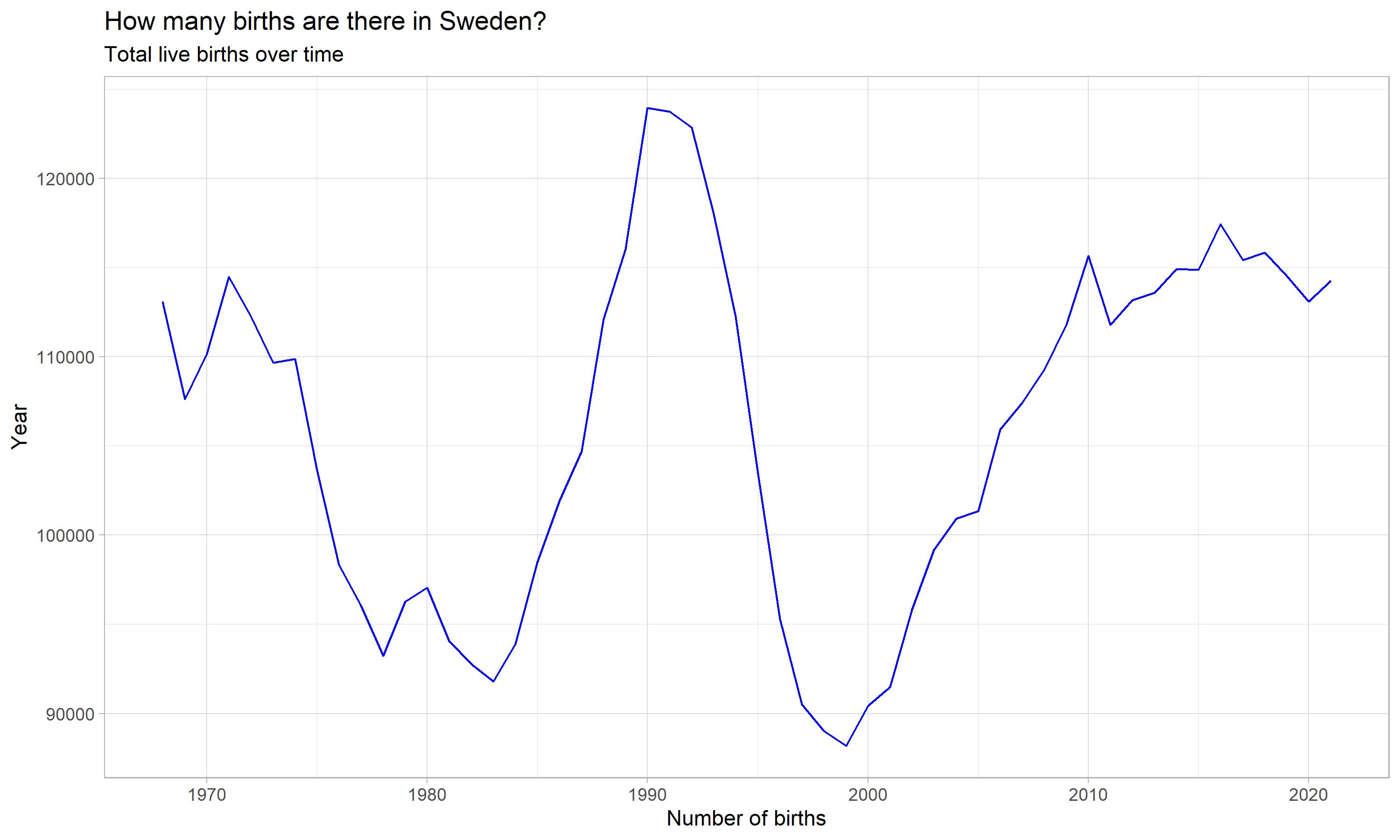 There’s loads to discover here and lot of really nice data to work with! For this example, we’ll take a look at some Swedish live birth data over time. From the above menu I continue through the menu making sure to make good use of the "*" option to select all, and check the options to download the data not as a JSON, but as a R data.frame. The result is live births by region, mother’s age and child’s sex for years 1968 - 2021 stored in the item “d”.