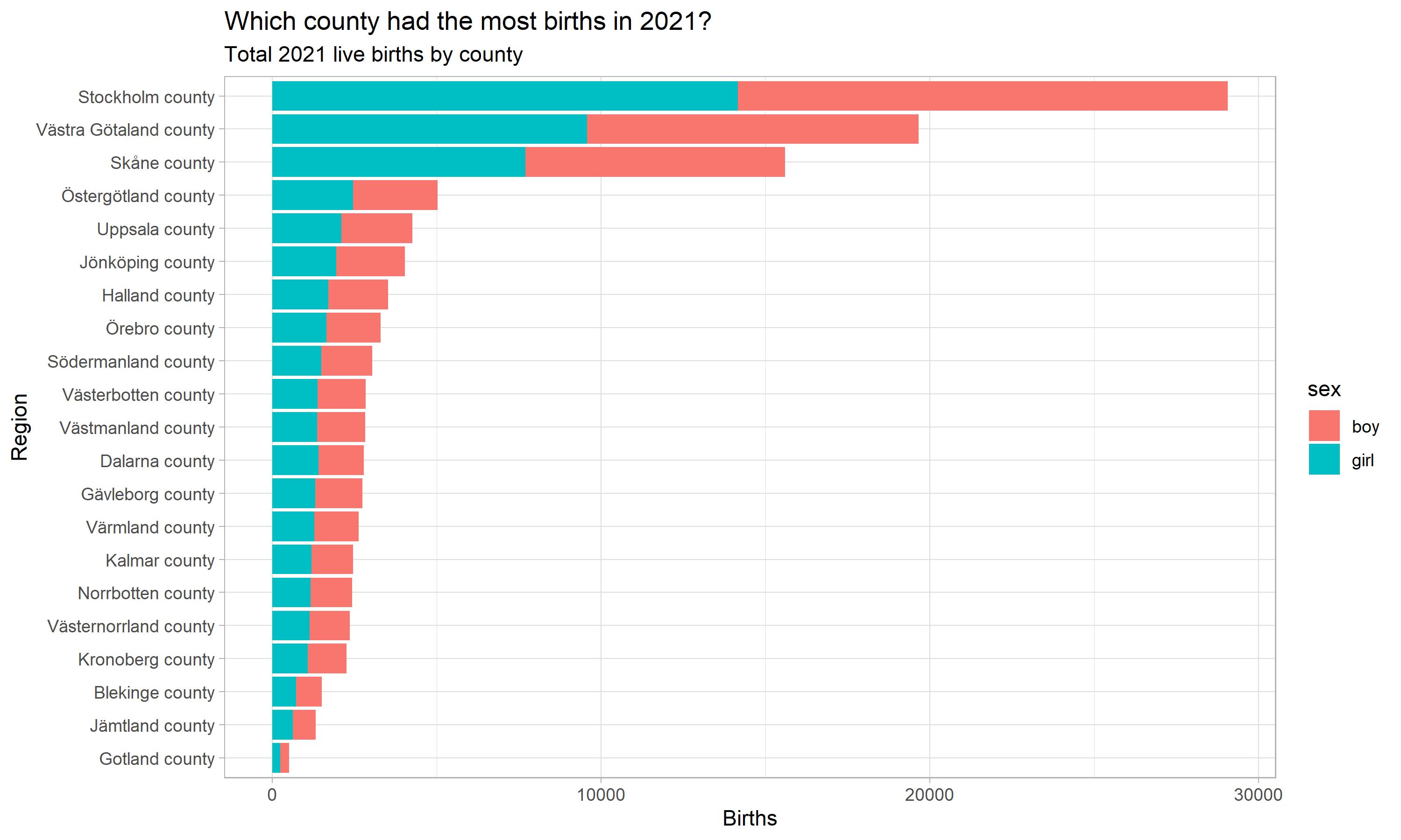 Results are not too surprising here with the top three counties of live births aligning with the three most populated cities in Sweden: Stockholm, Göteborg, and Malmö. Looks like a 50/50 split with boys and girls being brought into this world.